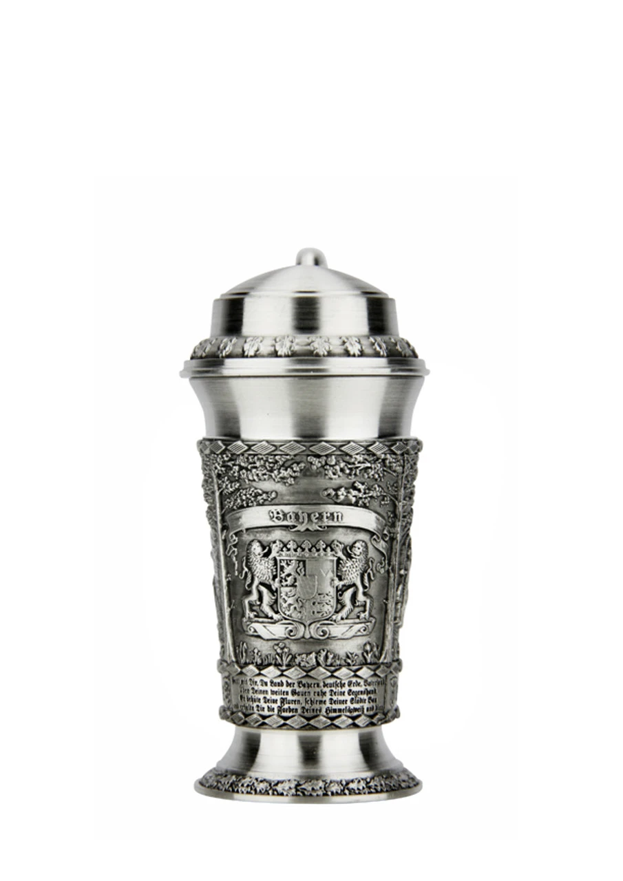The first two stanzas of the Bavarian National Hymn or Bayernhymne is shown incised in minute letters below the lion crest. Oak trees frame the scenes with Bavarian lozenge pattern and oak leaf border accents. Coat of arms encircle the base of this mini pewter stein.