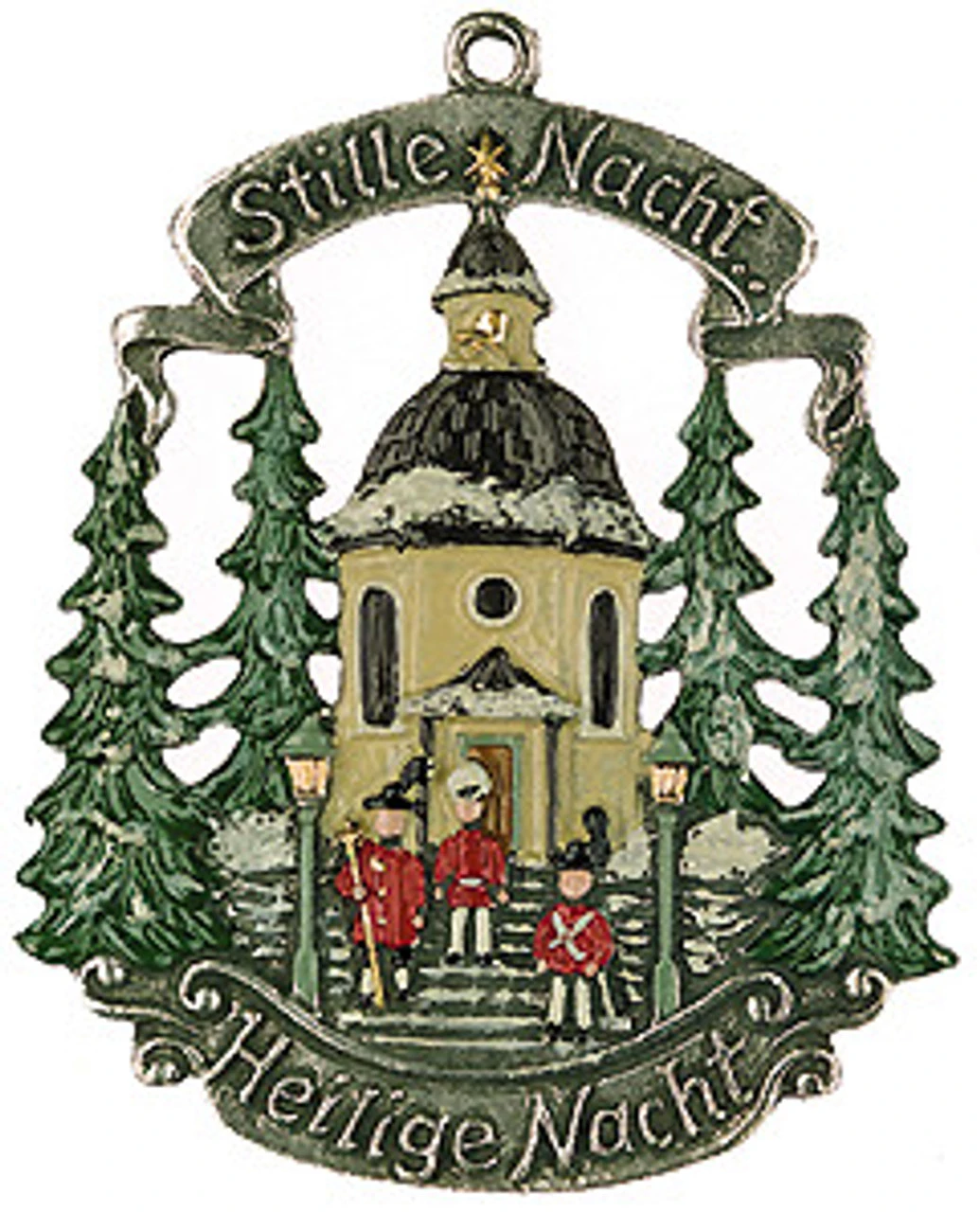 The famous Church of St. Nicholas, the alpine chapel where “Silent Night” was first performed in the year 1818, is depicted on this German pewter Christmas ornament.
